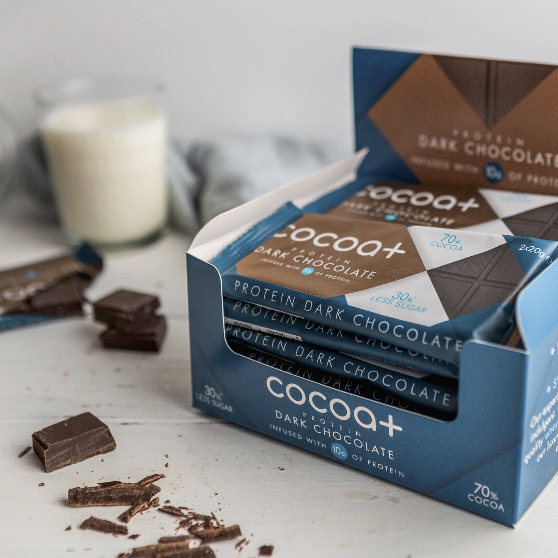 Indulge in smooth luxury 70% cocoa infused with the finest whey protein isolate sourced from grass-fed cows. All the benefits of rich dark chocolate, without the bitterness and with less sugar. An all natural, creamier, healthier alternative packed with natural fibre with a rich cocoa taste.